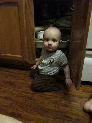 Well it is official, Daddy has to start putting the locks on the cabinets. Connor is into everything, I mean EVERYTHING! Isn't it funny how everything that he can play with, he normally doesn't and everything he is not supposed to have seems to find it's way into his hands. Connor enjoys cooking in the kitchen with Daddy, pulling everything out of the cabinets and making a mess. Who knows, this may be the beginning of a wonderful cook! (and a messy one)